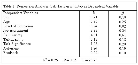 A test of the full model produced an R-square of 0.59 for satisfaction with job, indicating that over 59% of the variance in satisfaction with job was accounted for by the nine variables in the model (Table 1).
