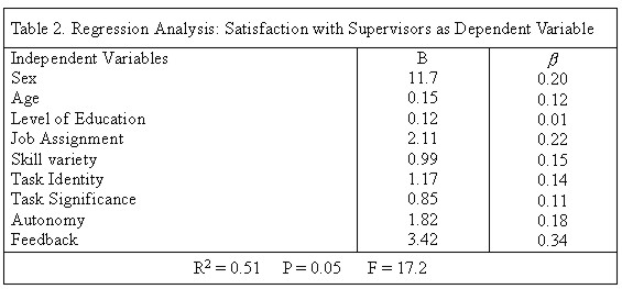The autonomy variable turned out to be a strong predictor of satisfaction with supervisors (b = 0.18). This results shows that there is a statistically significant relationship between autonomy and satisfaction with supervisors. As expected, such variables as skill variety, task identity, age, and task significance have significant positive influences on public officials satisfaction with their supervisors.