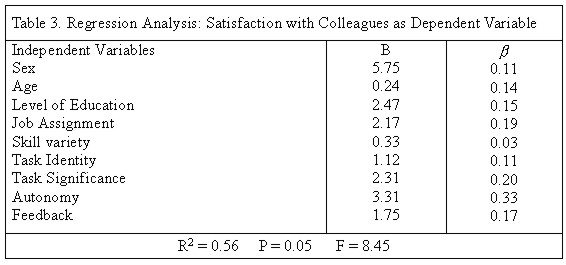 A test of the model produced an R-square of 0.56 for satisfaction with colleagues, indicating that over 56% of the variance was explained by the nine variables in the model. Eight of the nine hypothesized relations between predictor variables and satisfaction with colleagues were supported. The only one variable that did not conform to hypothesized relations was the skill variety. As expected, autonomy turned out to be the strongest predictor of public officials' satisfaction with colleagues.