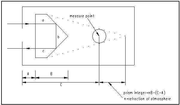 3.2. Zero correction3.2.1. Installation of reflector Since a prism reflector decreases if its slope angle is getting bigger to prism face, and it has much dispersion of light if measurement distance is getting longer, we should install a reflector uprightly facing to a measurement device when we install it. (1) Prism integer: The light radiated from the distance measurement device by light wave is reflected through the inside of prism, and if we convert the inside length into the distance in the air, it becomes longer two times. It is shown in Fig. 3 as follows.