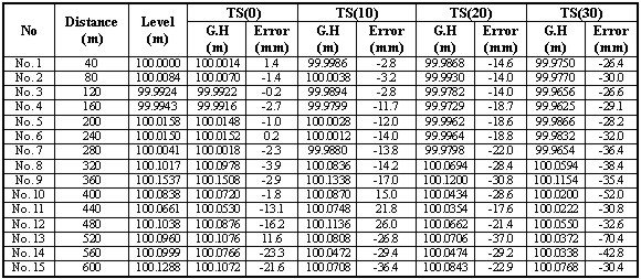 4.2. Measurement MethodWe selected a random point (No. 0) in the measurement object area, and we set out total 15 measuring points at the same 40m intervals from that point as reference. The distance between a target staff and a device is decided by several conditions, and since the collimation distance of leveling that requires high precision is 40m, this study also set the same interval of the target staff as 40m and measured each measuring point by the first class leveling device. And when we measured it by Total Station, we fixed the device at the reference point(No. 0), and made the heights of the device and reflector same, and we selected the direction of the incidence angle that faced downward, and we measured and compared it with the value that was measured by the first class leveling device and analyzed it. 4.3. Measurement result and analysisThe result that we measured respectively three times by the first class leveling device and Total Station and calculated the average value is as shown in Table 3 and Fig. 5. As a measurement result, it showed that the rearranged error to the distance of 600m measured by the first class leveling device was 0.6mm, and it satisfied the allowable error of the first class leveling, 1.9mm. And in case measuring by Total Station, it showed that the maximum distance to discriminate was 280m, and if we see the measured value without a prism's incidence angle, the error was 0.2∼23.3mm. These are the values appeared by each distance for No. 0 point, and it is considered that they appeared because of the observer's collimation error, light wave's dispersion coming from Total Station's main unit and since it was not vertically positioned to the exact central point of a prism. And when measuring by Total Station, we could calculate the correlation between the incidence angle and the error volume as the form of Table 3 Measurement result