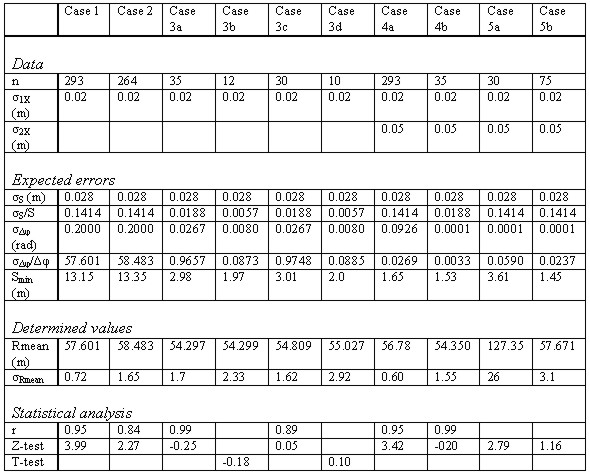 The expected accuracy of coordinate determination was 2cm [σ1X = 2cm]. This value has been revealed from an extensive experimental work carried out by the authors with robotic total stations (Stathas and Karabelas 2001). The Geodimeter 600 could realize a point measurement within 0.4-0.7sec with an accuracy of ±6mm±2ppm. A similar accuracy is expected by the GPS using RTK/OTF capability 6. RESULTSThe analysis initially aims at assessing the calculated radius values by compared them with the known one. Secondly, its capability of the various cases to recognize that the platform moves within a curve is evaluated. Finally, its sensitivity of the path deviation is tested. The first assessment was carried out by using statistical test, since the R-values of the various samples are assumed to be normally-distributed around the known value (for small samples the t-test was used). The second assessment was based on the determination of the correlation coefficient of the regression line of the bearing diagrams. The third assessment was based on estimating the minimum distance required to determine an appropriate bearing change that is greater than the expected errors (Smin = R (σφ + σΔφ). All calculations are stated in Table 3, and the results may be interpreted as follows. First, the estimation of the radius using the 3-point configuration does not vary using a DGPS technique or a robotic total station [cases 1&2]. In both cases, the deviation of the radius value from its exact value may be sought to the very small pace (dense observations) that strongly affect the bearing fluctuation. However, the correlation coefficients for using data from the entire path are high which shows that even a strong cloud of data is capable to indicate that the platform moves within a circular section.