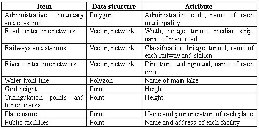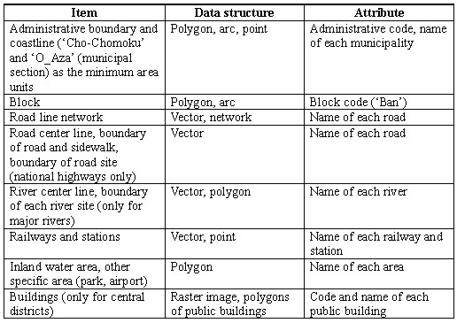 The technical standard included in the Final Report was developed through collaborative research between the Geographical Survey Institute and 53 private companies during the three-year research period starting 1996 and second phase is now continuing (explained below). Table 1 shows the list of data items for the Japanese framework data.