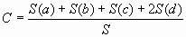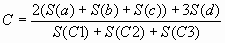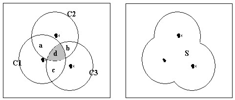 The idea that was discussed in Overlap Analysis method, which is based on the overlapped areas of unit circles, can be modified and applied to establishing clusters of houses using the GIS-buffering. Figure 3 shows (a) the overlapping of buffered circles and (b) the cluster polygon that circumscribes them. If we follow the formula (4) and (5), the ratio of the total overlapped areas (2(S(a)+S(b)+S(c))+3S(d)) to the sum of the buffered circles (S(C1)+S(C2)+S(C3)) becomes as follows.