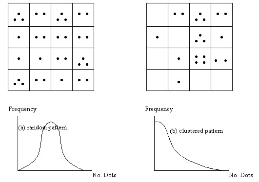 Quadrat analysis is represented by the probability density function that describes the number of objects placed in a grid of a space (Lee 1989, Thomas 1977). The given space is first divided into grids of same shape and size and the number of dots that belong to each grid are counted. As shown in Figure 1, the Quadrat Analysis classifies type (a) as random pattern and type (b) as clustered pattern using the ratio of variance to the mean. If the pattern is completely regular where each grid holds the same number of dots, the ratio becomes 0. The ratio becomes larger as the dots become concentrated on smaller number of grids with variance increasing.