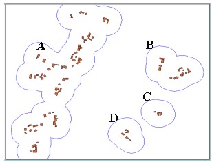 The methods discussed so far all deal with how much the entire dots in a given space are clustered and not how they are visually circumscribed or demarcated, which is the major concern in actual lifting processes in RDZ. For such purpose, we can use the buffering function that most GIS packages provide. As shown in Figure 2, we can easily draw polygons around existing buildings by using the buffering function with user-specified set-off distance. Polygon areas vary depending on the input radius resulting in different grouping such as A, B, C and D in the figure. For example, we can group B, C and D into one using longer buffer-radius or exclude some small groups according to decision strategies.