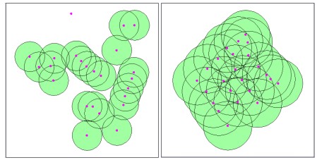 Contrast to the previous approaches which use either the number or distance of dots to calculate the degree of concentration in the study area, Overlap Analysis uses overlapped areas created by unit circles centering around randomly distributed dots and the mean distance of them (Koh 1995). Overlap Analysis analyzes the distribution of dots by calculating the ratio of total overlapped area to the total area of unit circles as follows.