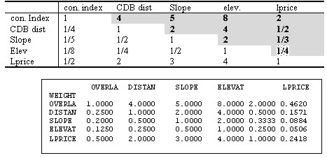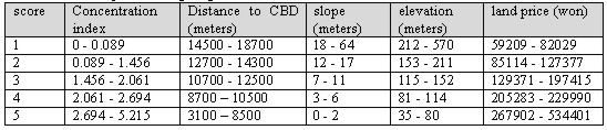 In order to analyze the ‘developability’ or the priority for restriction-lifting among the clusters of houses, different decision factors should be taken into account. Not only should the decision making include various factors such as slope, elevation, distance to CBD, distance to highway/railroad, land price and environmental protection, but it should take into account that each of them has different importance or weight value. If we assume that more physical and environmental elements a site satisfies, more developable it becomes, the overlay function of GIS can be effectively applied to such problems.