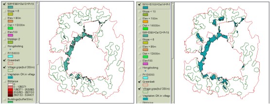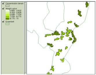 Physical criteria can now be multiplied by weight values before they participate in overlay process and then the resulting map contains aggregated scores where different importance is reflected. Figure 7 displays the residential clusters having 20 or more houses according to aggregated weight values.