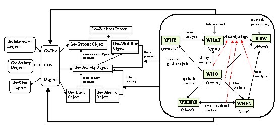 The benefit of process redesign is to mainly improve several dimensions with regard to products of cycle times, costs, and services and qualities by using a business model that starts to examine current value of their products with questions of "why is" today, but, is a valuable tool in determining the "what should be" (Meehan, 1995). Most existing business process modeling methods seek to define 3 or 4 dimensions that begin with analysis of business goals (why), activities and output (what), logical dependencies between activities (when), and role of actors (by whom) (Kueng and Kawalek, 1997). Bridgeland and Becker (1994) discuss four variances (why, what, who and when) of matrix with relevant analysis. Kradolfer and Geppert (1997) argue four requirements (who, when, which and how) of the workflow model. Van der Aalst and Van Hee (1996) examine three variances (what, how and by whom) based on the Petri-nets model. However, it seems that three or four dimensions based on business may not be enough to cope with a variety of process and activity of geo-business that should regularly update change of land records and land uses, and elucidate the causes and effects of dynamic actor's behaviors and complicated interactions in geo-processing environments.