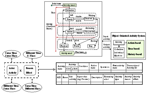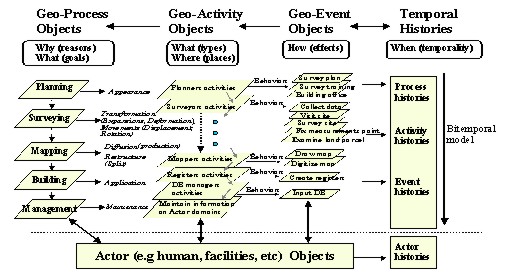 Although the WFMC (1999b) defines the characteristics of workflow process definition, workflow process activity and event, there might be other requirements for the relationships between process and activity concerning basic principle of the cause and effect, actor, space and time. Additionally engineering and database applications might have led to dynamic interpretations of processes and activities. Many researchers and scientists have long articulated process and activity model, however, it might be still hard to classify and aggregate various types of activity. Particularly, multi-dimensional aspects of geo-activity objects are too immense to define activity instances when connecting with process and event instances. Here, we focus on further activity model enabling to illustrate the relationships between process and activity state, and actor manipulation. The holistic approach is used to portray a framework of geo-process (Fig. 2) that intends to deal with activity object as a core of workflows leading to the history at a specific application. Meanwhile, there are many activity-oriented approaches from IDEF0 (Huo, 1993), workflow activity model (Eder and Liebhart, 1994), etc and role-oriented models (Warboys, 1998). These two approaches may fail to represent the true complexity of work (Kueng and Kawalek, 1996) and may not be suitable for describing transactional complexity of temporal logics among various activities.