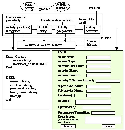 Activity design begins with the recognition of existing environments in terms of surveying plan, law, regulations, etc that define and identify geo-activities (Fig. 4), and then continuously generates activity instances (Teege, 1996) and transform theirs attributes and methods based on the flexibility of the object-oriented mechanisms. By interacting with actors, it brings about determinant results of geo-products or feedbacks of activity. However, there are always technical problems in detecting what activities are happened and changed, and where they are. To respond these questions, a set of collaborative work for geo-workflow management that is appropriate to distributed object system can be considered. The simplest way to denote spatial events and activities in geo-process is by actor's operating system ID. This helps geo-activity to associate actors with activities. Generally, it would be impossible for actors to know about other geo-activities and specific state of other actors such as their roles, whether they are active in the system. To illustrate the concept of actor behavior's detection, consider the above example user and group class in state transition diagram. Each geo-activity is represented as an object in which the operating manager (or user) stores pertinent information and can be aggregated in a user-group or large group of geo-activity databases. The main constraint with this approach is that it might be hard to bind information of geo-activity's changes from different Departments and other concerned authorities. Particularly, when the same contents of actor activities arise from different users, a dynamic way of temporal logic properties must be considered. Since most GISs packages might have shortcomings to support applicable model of spatial processes or geo-activities with temporal object, it might be hard to explain how current workflow model could be harmonized with versatile concepts of geo-processes and activities.