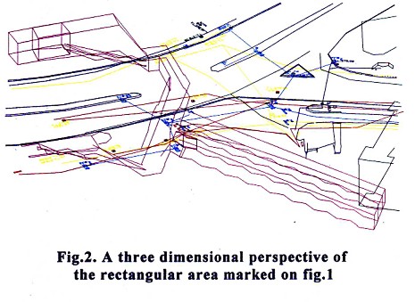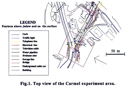 During 1998-1999, a practical experiment of a three-dimensional cadastral measurement (sponsored by SOI and ILA) was completed. As an appropriate site, the Carmel center of Haifa (in the northern part of the country) was selected. Four cadastral blocks compose the site, three of them are still under registration process. A bridge for pedestrians is located in the center of the site above the surface. The upper end-station of the Carmelit subway (connecting the Carmel center on the hill-top and Haifa downtown along the Mediterranean seashore) is situated under the surface. As regular cadastral measurements are completed in two dimensions, special technical guidelines were worked out for three-dimensional measurements. All the surface facilities, the bridge, the buildings and the entrance to the subway were measured by traditional geodetic methods. Most of the underground infrastructure and facilities were mapped by ground-penetrating radar technique (Kovas, 1991), by Israel Institute of Geophysics. All measurements were connected to the New Israeli Grid and to the national vertical control system. A segment of the results is depicted in Fig. 1 and Fig. 2. Lately, Stoter described the 3DCAD experiments in Netherlands (Stoter, 2000). Based on the article, a number of principal similarities can be found between the Dutch and Israeli efforts.