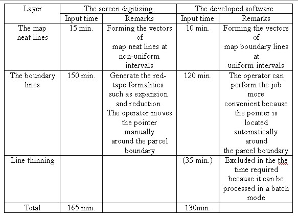 <Table 1> shows the result of the comparison. There were no differences in inputting layers of the map boundary lines. But, using the developed software we could input the map boundary lines at the same interval, and could input the map boundary lines effectively even if the map boundary lines were distorted. And, when inputting the layers of the boundary lines, we could save time(approximately 30 minutes) using the developed software. This means that the operator's charge could be reduced. because the pointer was located within less than 1-2 pixels from the center of the parcel boundary lines.