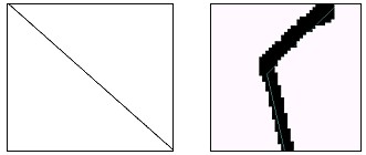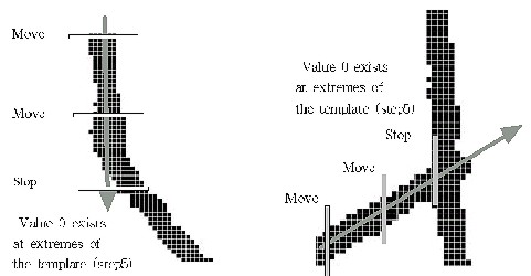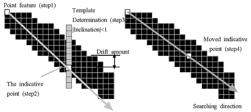 • Step 5. Move the template along to the line using the direction determined from step 2, the shape of template from step 3, and the inclination from step 4. If the value of 0 exists at both extremities of a template, then it is considered as the broken point or the intersection point. And stop the advance of a template, and wait for the user input.