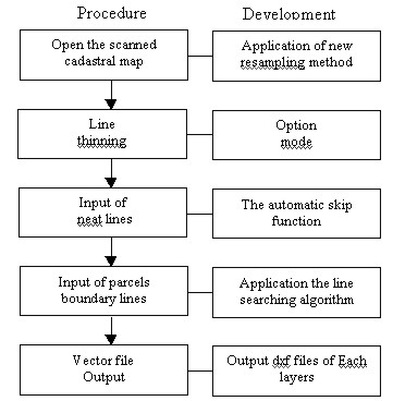 To overcome the weakpoints of manual input method, screen digitizing and automated input method can be introduced. Merits of these methods are that the original data is not changed, because all the processes are applied to the scanned cadastral maps. But the screen digitizing method has no advantage of shortening the input time compared to the manual input method, and the automated vectorizing method has the different result in the number and position of vectors as in the original data. Besides, it can be influenced by the quality condition of the map. Therefore, these two methods cannot be the efficient tools in digitizing the cadastral maps. Though there were numerous attempts to induce the automated vectorizing for the digitization of the cadastral maps, the automated vectorizing methods could not be adopted because it could not satisfy the accuracy needed in the cadastral maps and these works are closely related with the property rights of the people.