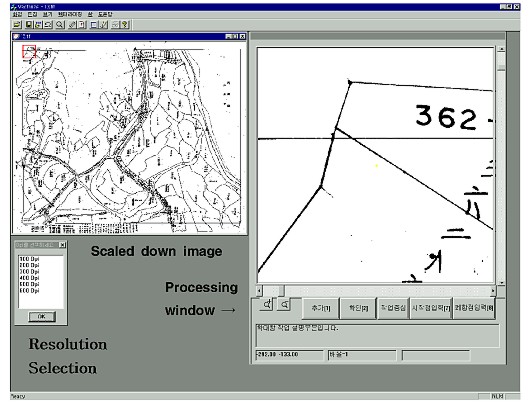 Scanning gives the basic data for all of the vectorizing procedures. Scanned cadastral maps can be accessed with the open menu whatever its format is. In this procedure our new resampling method is applied. When a cadastral map is scanned at the resolution of 400 dpi, the raster image is larger than 8000×7000 pixels. So, in the general image processing software, lines in the cadastral map can't be seen in a scaled-down image. In <Fig. 4>, the left is a cadastral map resampled within 600 pixels. Because it plays the role of an index map in the vectorizing procedure, we applied the new resampling method to provide an operator clear-cut lines. <Fig. 5> shows the resampled result of 11000×9000 pixels image. <Fig. 5(a)> is the result using our software, and <Fig. 5(b)> is the scaled-down image of a general image processing software.