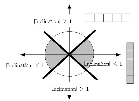 In step 3, according to the inclination between the broken point or intersection point and the indicative point the rule of determining the shape of a template is as followings. In <Fig. 6>, the center of the coordinates is the point inputted by user. If the inclination has the value between -1 and 1, then we use the vertical shaped template. If the inclination has the value more than 1 or less than -1, then we use the horizontal shaped template. The length of template is determined from the scanned resolution. The higher the resolution is (the thicker the line is) , the longer the length of template is.