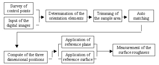 OBJECT'S SURFACE ROUGHNESS MEASUREMENT USING A HIGH RESOLUTION DIGITAL CAMERAHyosung LEE, Yangdam EO, Yongil KIM and Kiwon AHN, KoreaKey words: AbstractThis study aims to present an extraction of the three-dimensional positions and precision measurements of an Object's surface roughness using stereo digital image data obtained from a high resolution DCS 420 digital camera. For real-time processing, a primary window operating roughness measurement system was constructed by means of Visual basic 6.0 in Windows. This system is composed of six modules; image edit, control point survey, bundle adjustment, automatic matching, three dimensional positions generation, and roughness measurement. As the analysis results of measurement accuracy for a digital camera that uses this system, the roughness error of the normal distance between the best fitting reference surface obtained by the least square method and sample points in the ideal plane or surface did not exceed ±0.1mm 1. INTRODUCTIONIndustrial products or instrumental components and structures of various manufacturing methods do not correspond indispensably to a design plan. Also, because surface roughness for quality control is a very important physical quantity and closely associated with the character of the material, it should be measured in the sub-millimeter order. Especially, the manufactured stone is used in the construction materials sectors, also, because the roughness of manufactured stone is very small, a precision measurement method must be used to obtain accurate values. Since most of the methods for surface roughness precision measurement measure very small segments of metal or assembly machines in the laboratory, structures of forms such as the manufactured stone are unsuitable for measurement. So, the digital close-range photogrammetric technique which can be measured directly on the field site is considered to be an efficient method. In addition to this technique should be measured as accurately as possible to the extent of sub-millimeter order, if using a high resolution digital camera which can directly download to a notebook computer in the field, can quicken the process and make it more effective. This paper aims to construct a stone's roughness measurement system using a digital camera and Microsoft Visual basic 6.0 of Window environment for real-time measurement. Also, after acquiring digital images of the ideal plane and surface stone are scarcely roughness using the DCS 420 digital camera, surface roughness was measured using the reference surface that was computed by the least square method, and the measured result values were compared with the result values by the Rolleiflex 6006 metric camera for evaluating the processing capability of the surface roughness measurement of the DCS 420 digital camera. 2. CONSTRUCTION OF A PRIMARY INTEGRATED ENVIRONMENTIf subjects that utilize surface roughness measurement by the digital close-range photogrammetric technique are constructed independently from the integrated environment, this can quicken the process and make it more effective. Thus in this paper, a primary roughness measurement system is constructed that uses a digital camera and Microsoft Visual basic 6.0 of Window environment for real-time processing. A menu module on this system was constructed as sub-menus that image viewer, survey of control points, geometric correction, bundle adjustment, auto matching, computation of three-dimensional positions, and surface roughness, after the main screen menu was constructed using a Multiple Document Interface form for convenient use. In the case where a sub-menu consists in the main screen menu, the main screen menu provides workspace in the application program for the sub-menu screen. Figures 1 and 2 show the flow chart and main screen menu of the constructed system.