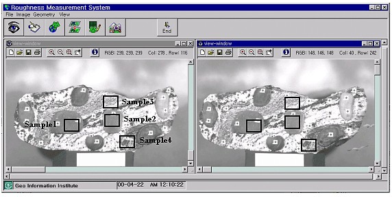 The average of surface roughness from the DCS 420 digital camera shows inaccurate results with approximately 0.03mm greater values than those of Rolleiflex 6006 metric camera as a whole, as shown in Table 4. The reason for this result is that a digital camera is a nonmetric camera without calibration data and resolution by the CCD sensor is fixed as 1524×1012 pixel, and pixel space of CCD arrangement is not constant. On the other hand, metric camera provides calibration data related with lens distortion, and the resolution of metric camera can be adjusted at user's disposal after film scanning. 5. CONCLUSIONFrom stone's surface roughness measurement using stereopairs of the ideal plane or surface acquired by DCS 420 digital camera and a primary window operating roughness measurement system,