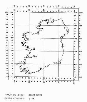 Figure 1: ITM and IG coordinates for Ireland 5. COMPARISON OF THE PROPOSED PROJECTIONSThe effects of the three projections have been compared in relation to scale correction, area and convergence; figures are included in Appendix B. Scale CorrectionFor Transverse Mercator projections, scale correction is a function of grid distance from the central meridian. It is therefore constant for any given easting, and is independent of the northing. The range of scale correction resulting from both IG and ITM is 355 ppm, whilst UTM has a range of 659 ppm. However, IG does not have a standard parallel (where scale is unity). Although UTM has one standard parallel, the location of the central meridian results in larger scale corrections on the West Coast. Since ITM is secant and centred on Ireland, it provides two standard parallels (see Figure 2).