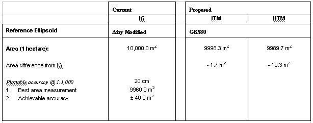 Table 2: Comparison of the effects of Scale Factor between the three projections 2. Area CorrectionTable 3 below shows a direct comparison between a current IG area measurement and the worst-case area differences in the ITM and UTM mapping systems: