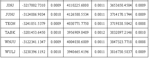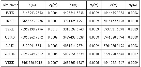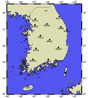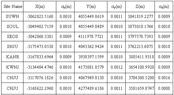 For each site eleven-day mean was computed from continuous daily GPS solutions. Daily output solutions included a vector of all estimated parameters and a full covariance matrix of errors. The daily position estimate vectors and covariance matrices were combined to yield one final position estimate vector and covariance matrix. The coordinates computed in terms of ITRF97 at epoch 2000.343 for the Korean GPS fiducial network as shown in Table 1. The cartesian components of each site position has small error, 1 mm for x, y and z, which were highly correlated.