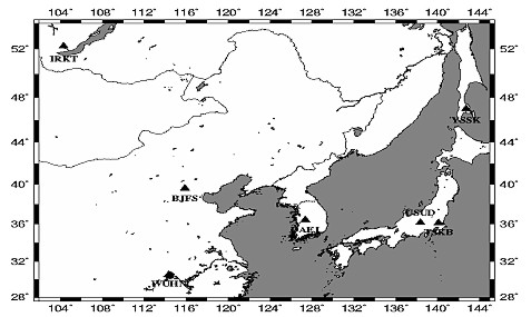 Data processing started with the automatic editing of the GPS data. This included elimination of bad data points and cycle slip detection and repair, when possible. The first set of ITRF values were computed using 11 days (9th November, 2000 - 20th November, 2000) at 14 permanent GPS sites. This work was used a processing strategy compliant with IGS standards. The nearest seven IGS sites (Tsukuba, Beijing, Daejun, Wuhan, Usuda, IRKT, YSSK) are constrained in the solution that use the IGS products (precise ephemeredes, orientation parameters and coordinates) to produce results with an accuracy of a few centimeters. Figure 2 shows the location of IGS sites used and Table 1 shows the coordinates of seven IGS sites.