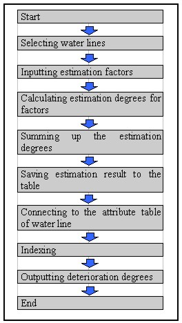 Deterioration estimation system which is for evaluating water line deterioration consists of numerical weight input system, deterioration output system, and accidental frequency output system. Numerical weight input system can input estimation scores of various estimation factors about specific pipes. It is designed every kind of input screen differently each other, because there are numerical differences of estimation factors from 1 to 4 according to pipe type and pipe diameter described in chapter 2. Estimation factor code table and estimation factor classification table is drawn up in order to be appeared input screen automatically corresponding to that pipe, when user clicks specific pipe on screen. These two tables are linked with attributes table of water line coverage, therefore each pipes of them come to be linked with input screen according to 8 types divided in deterioration estimation model.