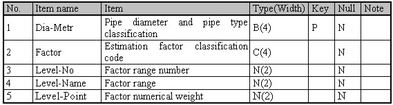 Relational table is drawn up using INFO Module of ARC/INFO to preserve continuously result data from estimating pipeline deterioration. Table 1 is estimation factor code table for deterioration estimation.