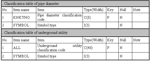 Lookup table can represent color or symbol of graphic output effectively3). Lookup table designed for this study are such as classification tables of pipe type, pipe diameter, year laid, accidental frequency, etc of underground utilities. Table 2 shows classification table of pipe diameter and underground utility.