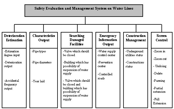 This system divides into largely 6 sub-systems and each sub-systems consists of 2~7 modules. Each modules are formed with items which should be applied to works directly by water line manager in a field. The structure of this system is equal to this.