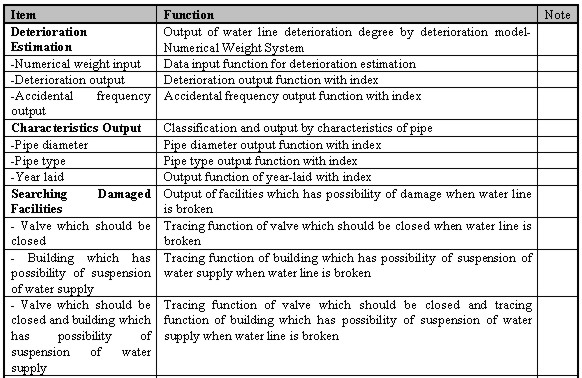 This system estimates water line deterioration considering various factors such as year laid, material, suspension frequency of water supply, etc. Therefore, this is rational and economical rather than estimating of deterioration and deciding replacement of pipe with one certain factor. And as it uses index, it can catch easily water pipe distribution according to deterioration.