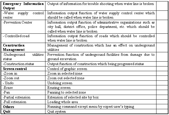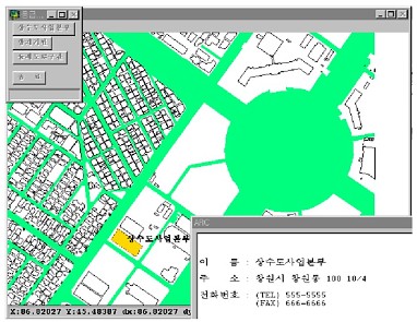Emergency information output system which offers useful information to recover in accident of water pipe provides information of water supply control center, prevention center, the controlled road. The output system of water supply control center and prevention center can inquire information of organizations which should be contacted with to recover promptly damage of water line. Attribute information of each system can updated easily because it is constructed in text file separately not in attributes table of building layer. Figure 6 is an output of water supply control center.