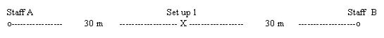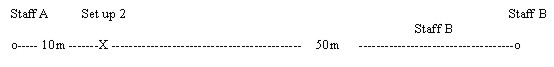 The two described procedures are designed for field and not for laboratory use. The results are specific for each determination and representative only for the particular conditions existing at that time: weather, environment, ground surface, equipment, staff members, etc. The equipment must always be acclimated to the environmental temperature and adjusted before testing in accordance with the manufacturer handbooks. (Step 3). Simplified field testThis test is based on a limited number of measurements (minimum 10) for check of the levelling equipment used especially on construction workside where radial/polar measurements with unequal sight lengths at each set-up are normal. Equal sight lengths are exceptions. Establishment of a test line: In a relatively plane area two points A & B have to be monumented at a distance corresponding to the maximum and minimum sight length ranges that will be used inside each specific project. As example if the needed sight lengths inside a construction project are between 10 and 50m, the distance for AB will be about 60m. Points A and B have to be stable during the test period. The measurements are made in two different steps. The first step with equal site length (30m) as a copy of the accurate test describes before but limited to 10 set-ups. The goal is to determine a reference height difference between A and B, value that is considered as the true value of the height difference of the levelled points A and B.