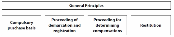 The recommendations are divided in five sections (Figure 1). General principles give overall guidelines to be followed when structuring regulations and activities in land acquisition by compulsion, and should be applied in all phases on the compulsory purchase process. The other four sections discuss in more detail, recommendations related to the separate phases of compulsory purchase process, i.e. compulsory purchase basis, proceeding for the demarcation and registration, the proceedings for the determining compensation, and restitution.